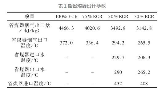 本文針對廣州某電廠采用以下2種方案進(jìn)行改造:方案1采用熱水再循環(huán)技術(shù),在汽包下降管合適的高度位置引出熱水再循環(huán)管路,經(jīng)過新增加的再循環(huán)泵加壓,引入至省煤器給水管路,以提高其進(jìn)口水溫。方案2是在省煤器旁通系統(tǒng),把省煤器分為2部分,中間設(shè)有中間聯(lián)箱,根據(jù)負(fù)荷不同啟閉旁路閥門調(diào)節(jié)通過省煤器的流量,改變換熱面積來調(diào)節(jié)煙氣溫度。該電廠鍋爐設(shè)計(jì)煤種為神府東勝煙煤,以下按設(shè)計(jì)煤種進(jìn)行計(jì)算,根據(jù)煤質(zhì)特性、鍋爐設(shè)計(jì)參數(shù),計(jì)算改造前在100%、75%、50%、30%連續(xù)經(jīng)濟(jì)出力(EconomicContinuousRating,ECR)工況下省煤器出口焓,從而得到煙氣溫度,如表1。