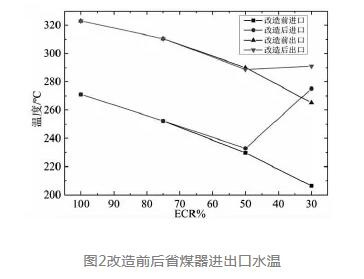 由圖1可知,熱水再循環(huán)方案主要由再循環(huán)泵、電動調(diào)節(jié)閥(給水調(diào)溫器)、電動閘閥、流量測量裝置、止回閥、三通閥和管道等組成。在汽包下降管合適的高度位置引出再循環(huán)管路,經(jīng)過新增加的再循環(huán)泵加壓,通過給水調(diào)溫器調(diào)節(jié)循環(huán)水量,再將高溫循環(huán)水引入至給水管路,以提高省煤器進(jìn)口水溫,降低省煤器水側(cè)與煙氣側(cè)的傳熱端差,減少省煤器吸熱量從而提高省煤器出口煙氣溫度。改造前后省煤器進(jìn)出口水溫見圖2。
