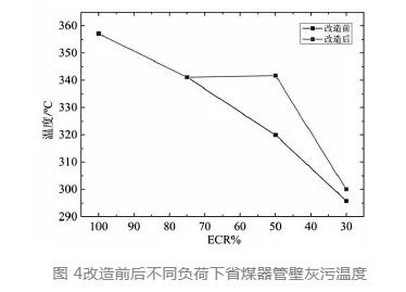 改造后處于干燒的管束管壁灰污溫度在長時(shí)間運(yùn)行下可視為與煙氣溫度相等。見圖4。由圖4可知,在30%ECR工況下,干燒管束溫度與改造前管壁溫度相比,高了4.2℃;在50%ECR工況下,則升高了21.8℃,但低于100%ECR工況下的管壁灰污溫度,所以煙氣溫度的提高對管壁影響不大。文獻(xiàn)是在額定負(fù)荷時(shí)直接對省煤器進(jìn)口位置短路引至下降管,增加了下降管的負(fù)擔(dān)而且降低了煙溫控制的靈敏性,干燒管束更加嚴(yán)重,本文省煤器管道部分改造,降低了改造代價(jià),煙溫調(diào)節(jié)更加靈敏。