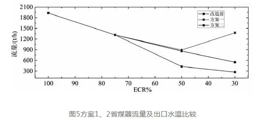 由圖5可知,熱水再循環(huán)方案在30%ECR工況下流量變化較大,若給水調(diào)溫器對機(jī)組負(fù)荷跟蹤不及時(shí)時(shí),可能會導(dǎo)致省煤器流量過大和汽包水位較大的波動,當(dāng)水位較低時(shí)容易引起蒸汽溫度急劇上升而導(dǎo)致水冷壁超溫爆管等事故,應(yīng)盡量避免水位有太大起伏。流量增大也增加了循環(huán)水泵的出力從而增加廠用電費(fèi)用,但在50%負(fù)荷時(shí)變化較小,如果電廠負(fù)荷變化不大該方案是較好的選擇。省煤器旁路方案隨負(fù)荷降低流量逐漸減少,干燒管數(shù)增加,省煤器使用壽命隨之縮短,使方案2間接費(fèi)用增加。